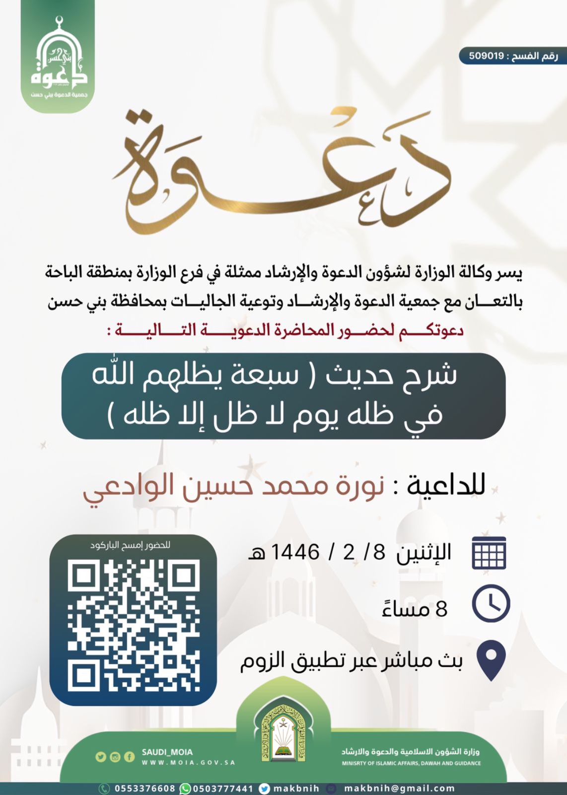 اليوم الإثنين الموافق 8 صفر 1446 هـ – 12 أغسطس 2024 م محاضرة نسائية بعنوان ( شرح حديث : سبعة يظلهم الله في ظله يوم لا ظل إلا ظله ) للداعية : نورة محمد حسن الوادعي .