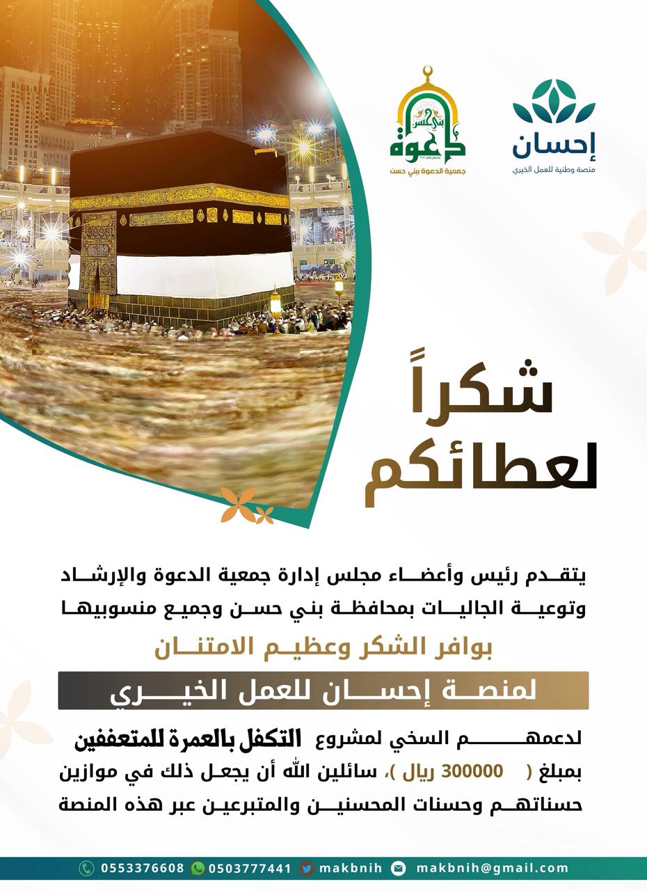 تقديم رحلات عمرة مجانية للأفرادٌ المحتاجون الذين يواجهون مشاقّ الحياة وصعابها ، ولا يجدون من مالهم ما يكفيهم لزيارة الحرم المكي الشريف وأداء العمرة .